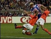 ![]() (1-2) Suker (36). A swift Croatian counterattack saw Prosinecki set free Asanovic who did well to hold play up on the right before passing to Boban, the skipper's first-time lay-off across the left edge of the area into the path of the star striker, was magnificently rifled home low with the outside of his left foot, through the legs of Stam and just inside van der Sar's left-hand post from 16 yards. |