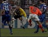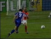![]() (0-1) Prosinecki (13). Suker released Jarni who broke down the the left flank before being pegged back on the edge of the penalty area by Stam, he waited for support and then laid the ball across the face of goal to Robert Prosinecki, the Croatian midfielder had to swivel 360 degrees before cutting back a low right-footed shot through the legs of Numan and beyond the right side of Dutch 'keeper Edwin van de Sar from nine yards. |